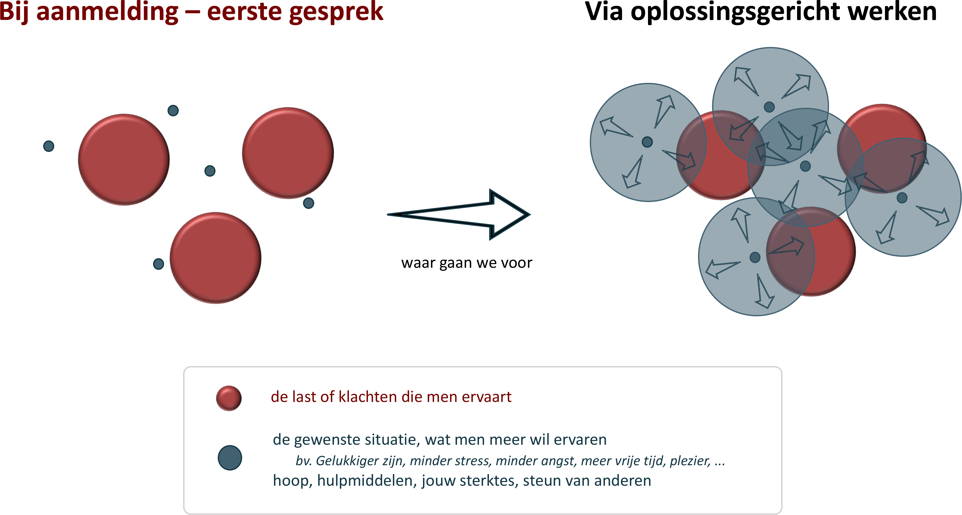 De klik voelen, erkenning voor de last en je gehoord en begrepen voelen. De last samen kunnen onderzoeken. Daarnaast evenveel of nog meer inzetten op de gewenste situatie. We willen zeer helder krijgen waar jij op hoopt. Het helpt als dit in termen van een positieve formulering is. Namelijk wat je wel wilt en hoe je die ‘wens’ dagdagelijks merkt in jouw doen, denken of voelen. Zo zorgen we voor het vergroten van de groene bollen (rechtse prent) waardoor je minder last (rode bollen) ervaart. Zoals je ziet zijn de rode bollen niet volledig weg, dat is vaak niet realistisch of haalbaar. Een deeltje last is inherent aan het leven. Zolang het maar draagbaar is.
